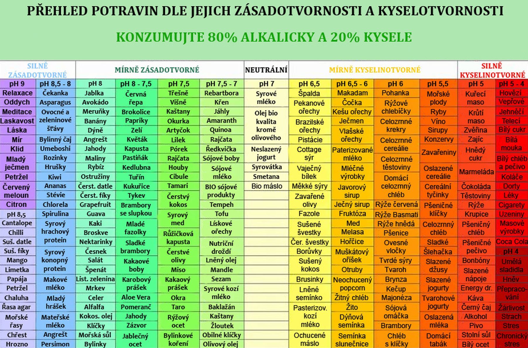 Pro udržení acidobazické rovnováhy potřebuješ 80% zásadité stravy, max 20% kyselotvorné stravy.